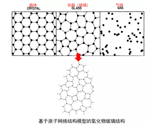 晶體、玻璃態、氣態物質的原子排布示意圖 圖源:[1][2]