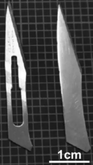 左邊為鍍有鋯基非晶合金的鋼制手術刀片,右邊為一片整體的鋯基金屬玻璃手術刀片。圖源:[6]