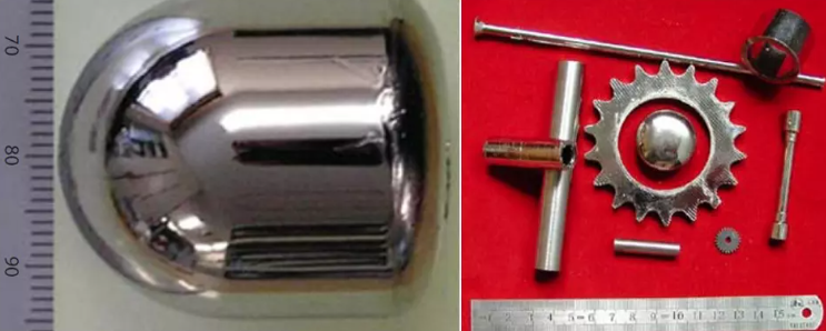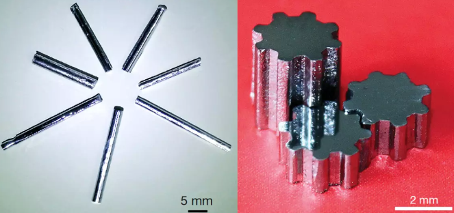 左圖是銥鎳鉭金屬玻璃的圓柱形棒材,右圖是銥鎳鉭金屬玻璃做成的微型齒輪,這些構件可以在極其惡劣的環境中應用。圖源:[8]