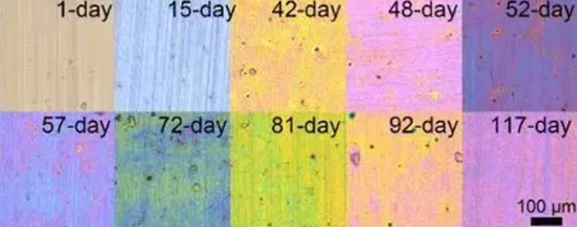 彩色金屬玻璃顏色隨時間變化規律,在一百多天的時間內,金屬玻璃的外觀變換了多種顏色。圖源:[9]