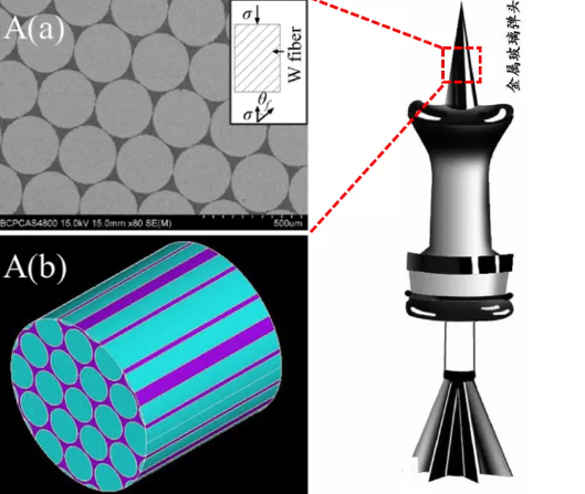 左上圖是第三代金屬玻璃彈芯穿甲彈材料的掃描電子顯微鏡圖片,左下圖是對應的模型,藍色的圓柱長條代表鎢絲,中間的紫色填充物代表鋯基金屬玻璃。圖源:[7]
