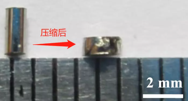 直徑為1毫米的圓柱狀鐵基金屬玻璃,以及壓縮實驗后的形貌。圖源:[5]
