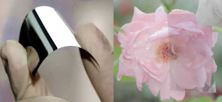 左圖是柔性優異的金屬玻璃皮膚的照片,很容易彎曲超過180度;右圖是通過調節金屬玻璃皮膚的厚度得到的“透明”金屬玻璃皮膚。圖源:[10]