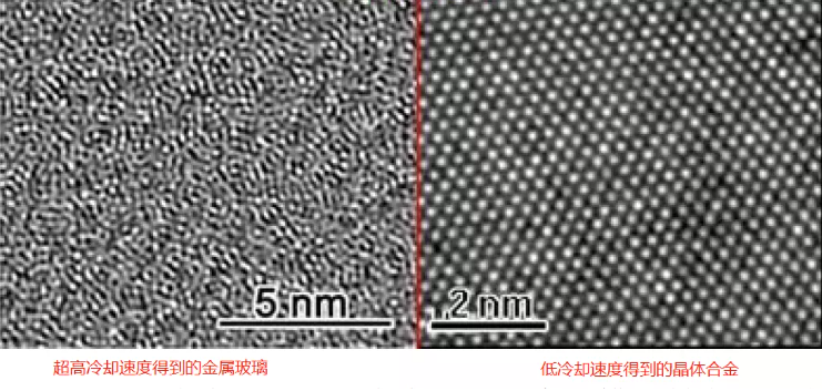 隨著現代冶金技術的發展,也就是熱合金熔體快速冷卻技術的不斷成熟,這項技術可以在室溫下保留合金的非平衡態結構,讓金屬熔體中無序排布的原子來不及擴散運動到平衡態位置,最終得到的固體原子構型也呈現出無序排布的特點。這種超高冷卻速度得到的合金就是具有玻璃一樣原子無序排布的非晶合金,也成為金屬玻璃。